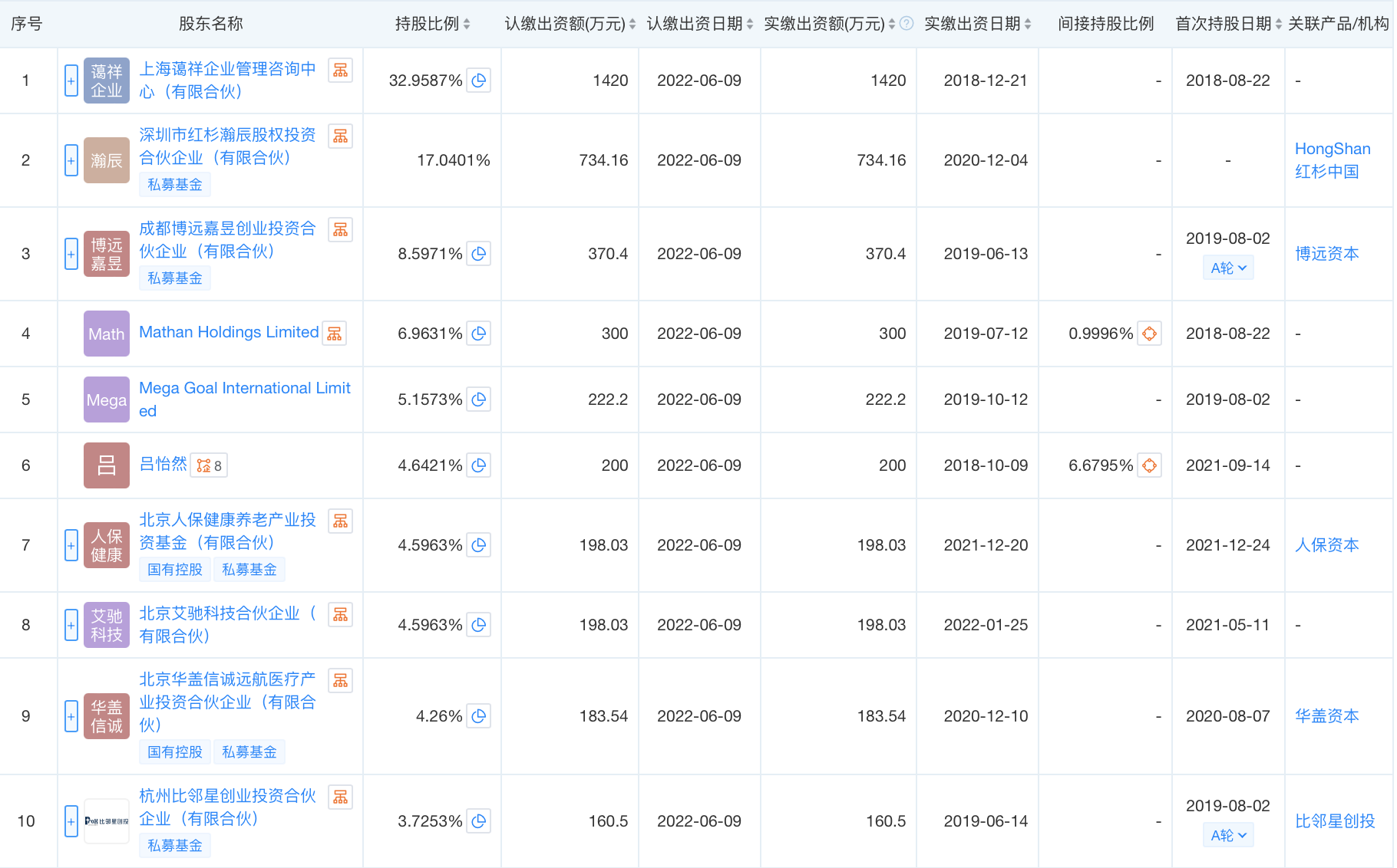 其于2019年8月完成的A轮融资由博远资本、比邻星创投参投;2020年7月完成的超亿元B轮融资,由红杉中国领投,华盖资本跟投;2020年12月又完成数亿元的B+轮融资,由泰康保险集团、泰康人寿、人保资本、红杉中国等参投;2021年12月完成的C轮融资中,泰康人寿和人保资本再次参投。